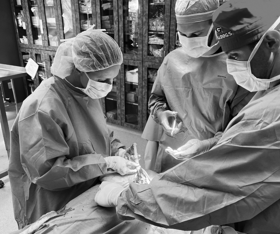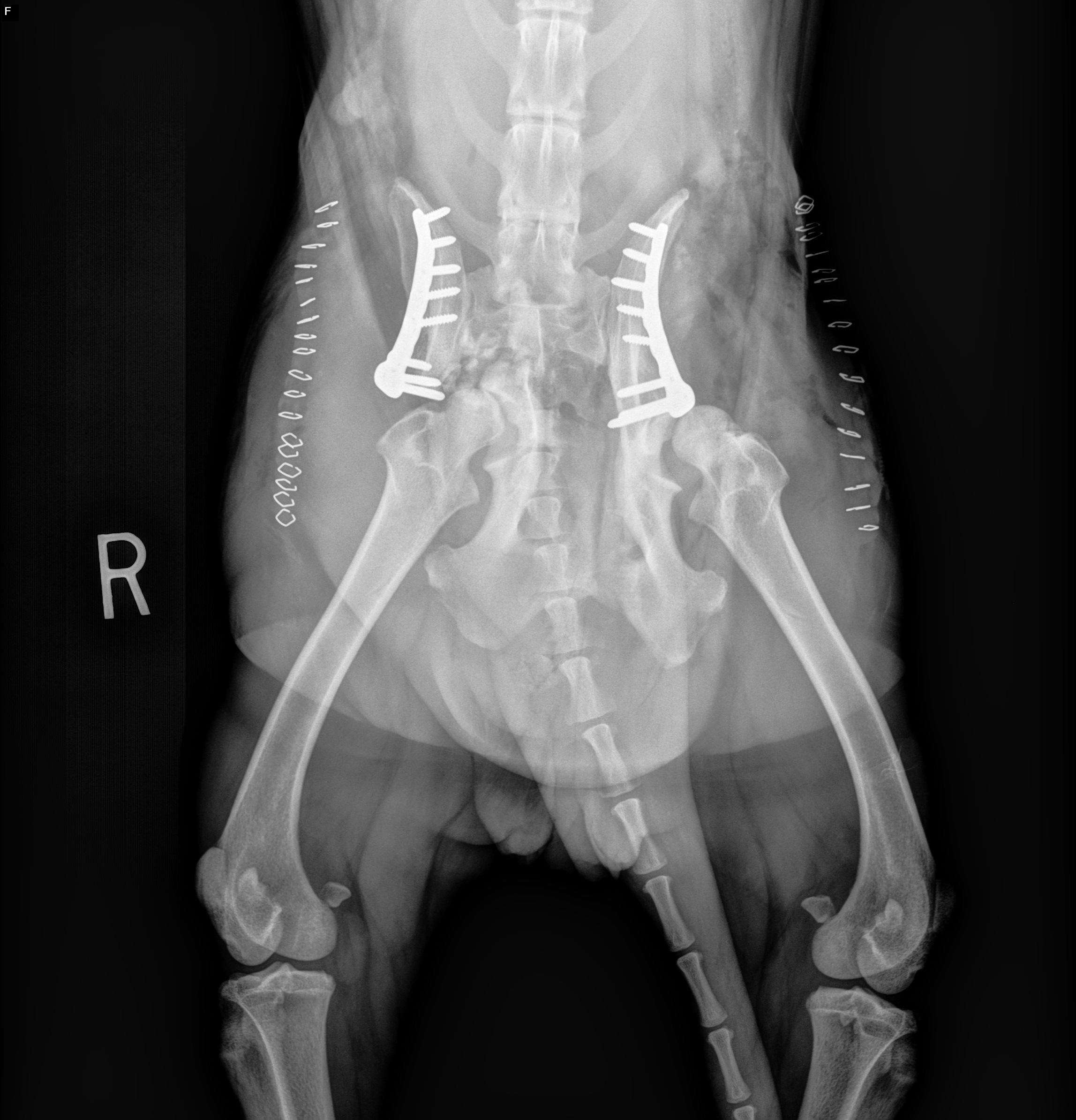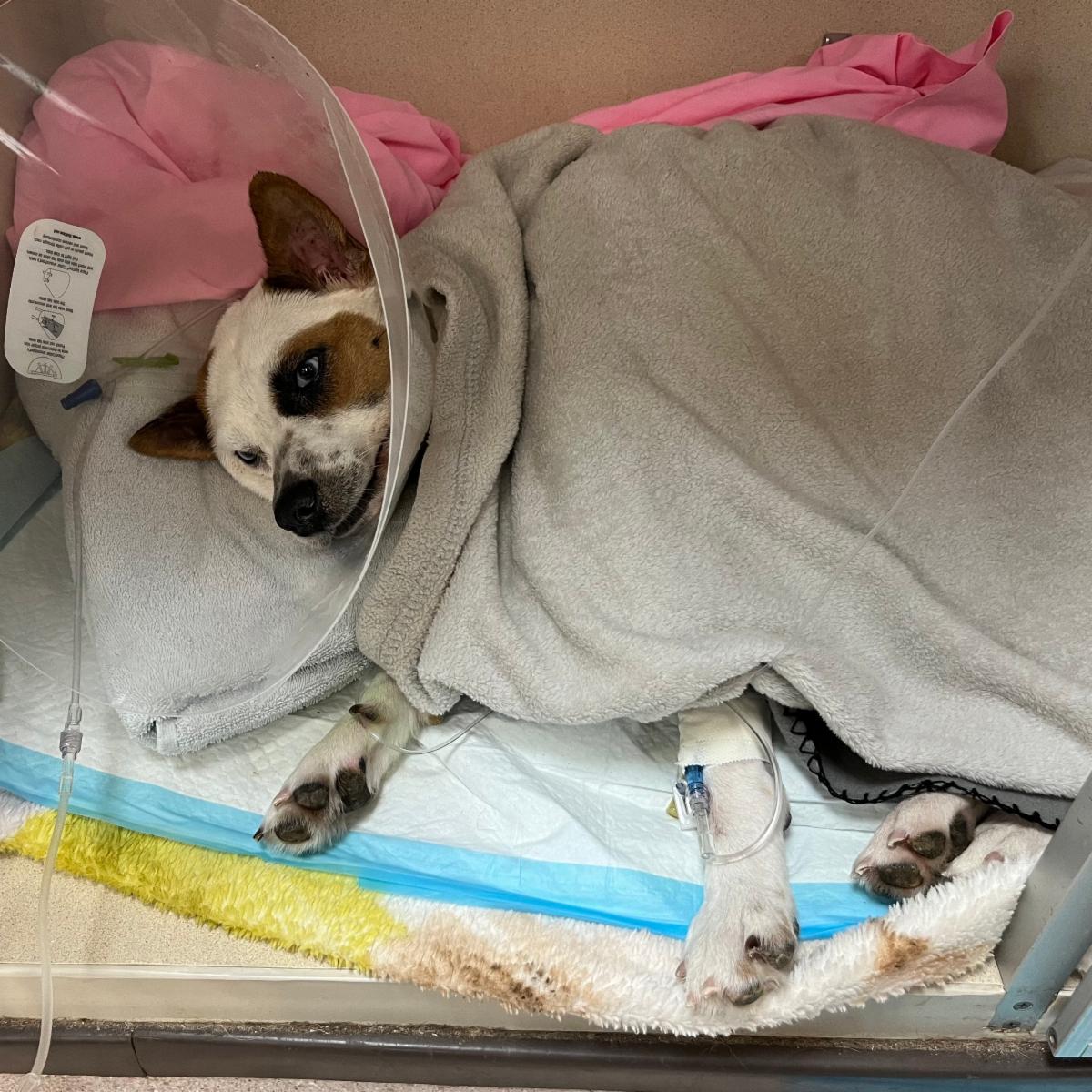 Walking into the office one early morning, we discovered this sweet soul unable to sit or stand. She had been abandoned on a dog bed - no note, no name, just her injured self and her bed. Poor thing would cry out in pain when she attempted to move. Her radiographs revealed she had SIGNIFICANT injuries: two fractured hips, one dislocated hip and a broken elbow. We managed her pain until we could get her into surgery at a specialty hospital. And multiple surgeries she has had!