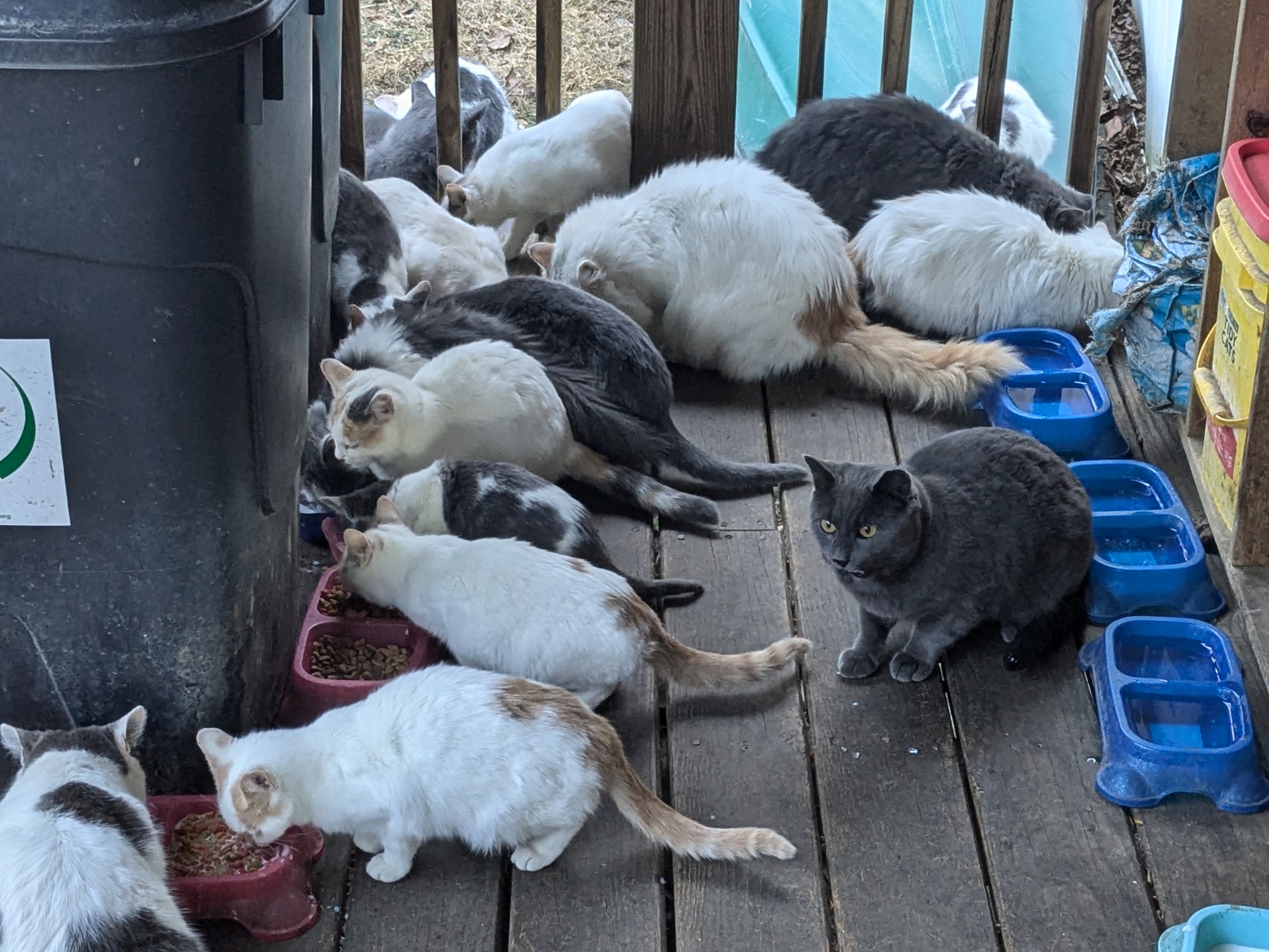 A local cat lover, Nancy O. reached out to the shelter for spay and neuter help for cats that she is feeding and caring for outside her home. Nancy, retired and living on Social Security, was somehow managing the care of 30 cats, 12 of them females. Once again, our core team trapped her cats, brought them in for surgery, and returned them to their home with Nancy. They even included food to help her manage feeding the community.