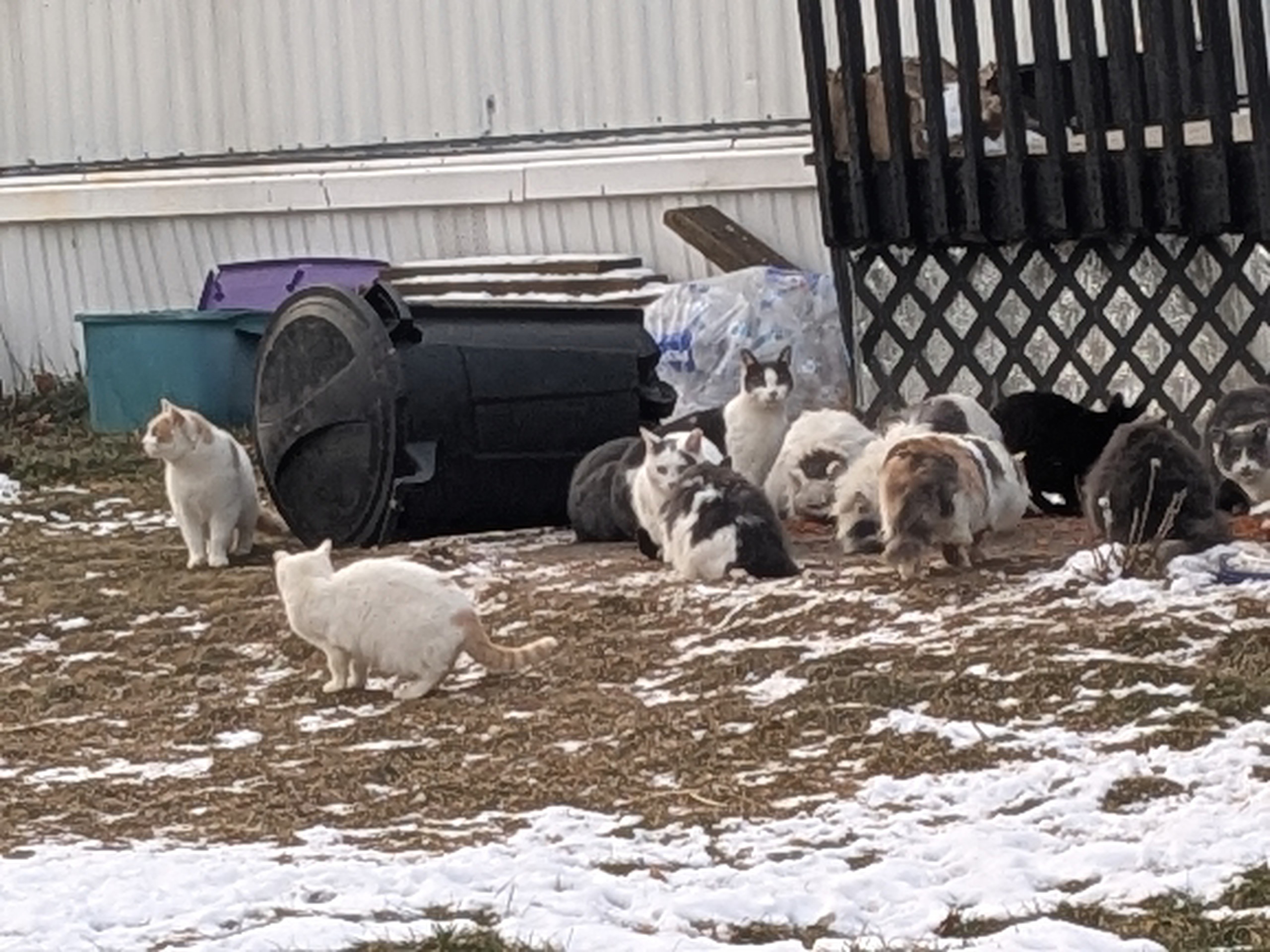 In March 2025, after the last snow, our staff and volunteers returned to Newfield with results that were completely inspiring. By the end of May, 76 cats were spayed or neutered, vaccinated, and microchipped, including 50 females. Two of our volunteers, Bob and Jackie, were at this home just a few days ago creating a winter "kitty motel" with plywood, coolers, and straw under this very porch. The owner said to them "I have only lost two kittens this year due to the TNR efforts, and normally it would be many, many more."