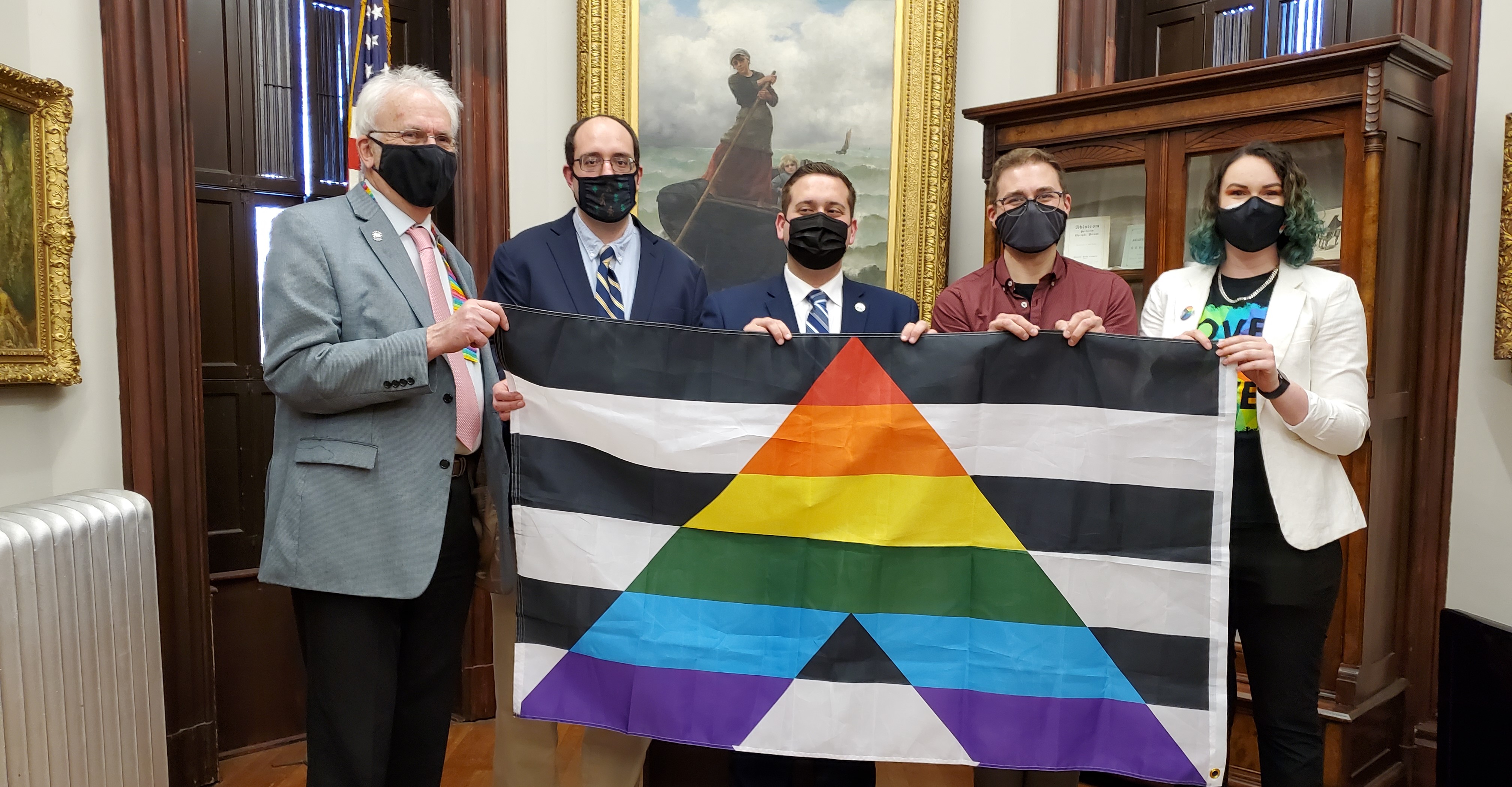 (Photo: Jamestown Pride Steering Committee Members celebrating the raising of the Pride Flag on National Coming Out day in October, 2020.)