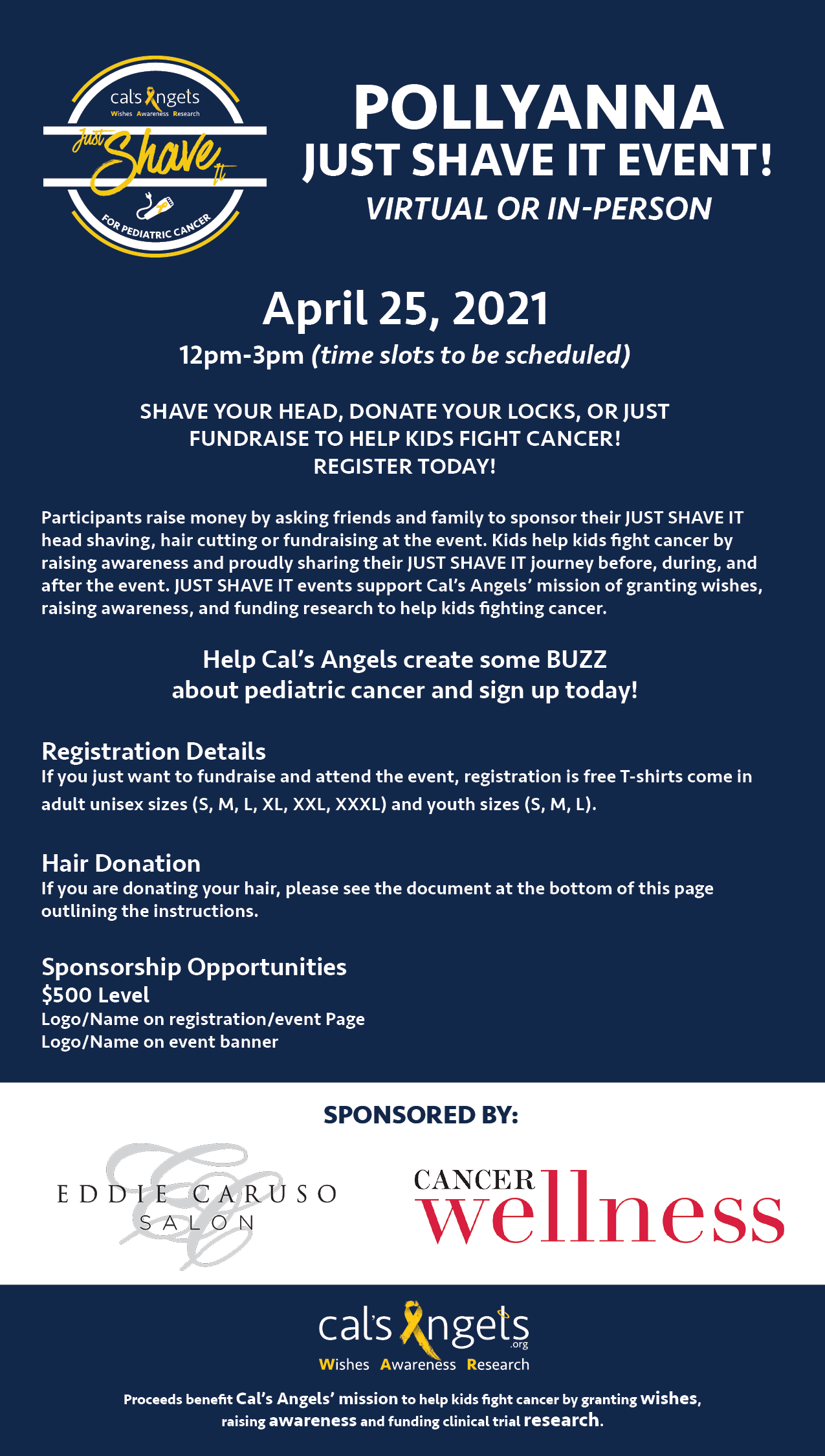 All proceeds from JUST SHAVE IT events will fund Cal’s Angels clinical trial research efforts to help kids who are fighting cancer right here in our community.