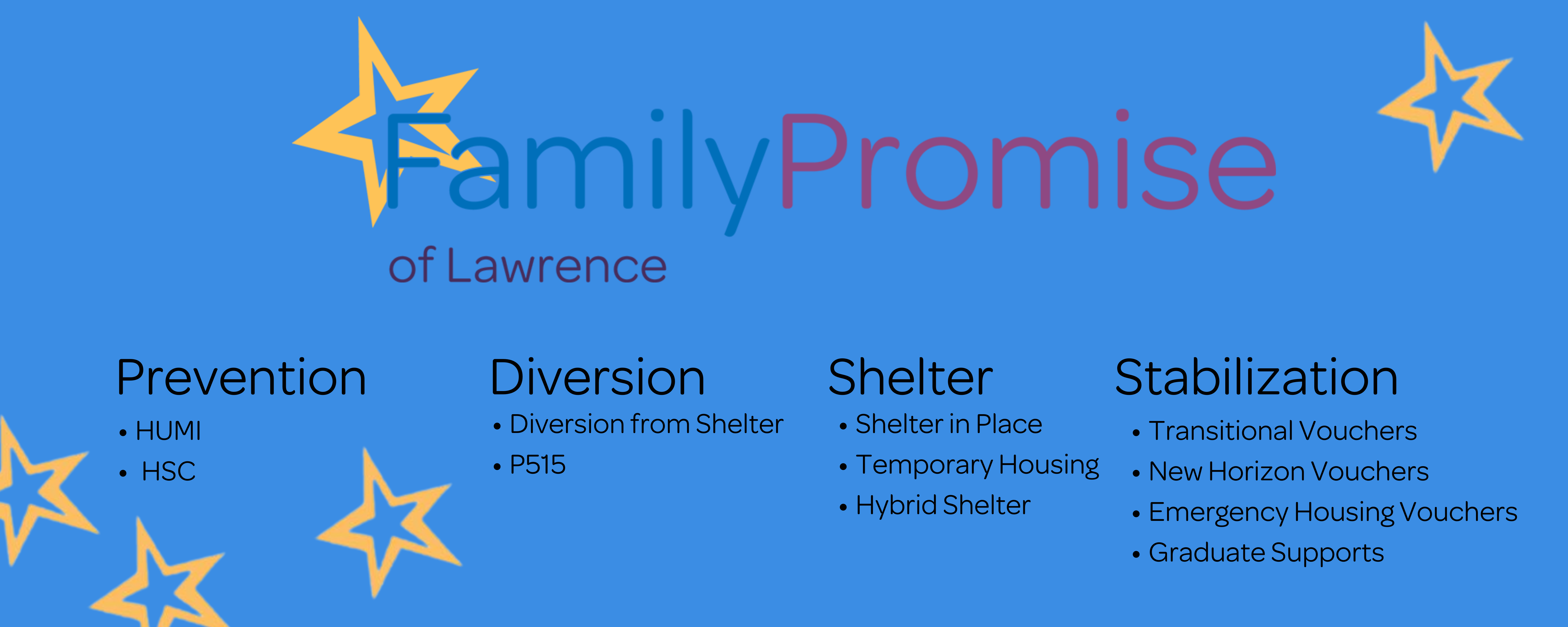 Life and day to day necessities are so expensive right now, imagine what it must be like for the families in our programs. In 2022 Family Promise of Lawrence served 266 families, that's 832 individuals, 479 of which were children. Donate today and help us continue serving children and families who are experiencing a situation of homelessness, or who may be precariously housed, get back to permanent, sustainable housing. With your help we can empower families and help them achieve stabilization! Every family deserves the opportunity to create a better and brighter future. Family Promise provides a continuum of supportive services from homelessness prevention, diversion, shelter, stabilization and graduate supports, and practical case management.