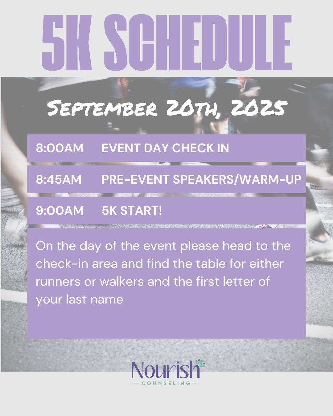 All proceeds go directly to Nourish Non-Profit, helping us provide low-cost mental health services to those in need. This year's race is held in dedication to Jeremy Whitehead, a cherished community member, veteran, and wellness advocate who played a vital role in launching this event in 2024.