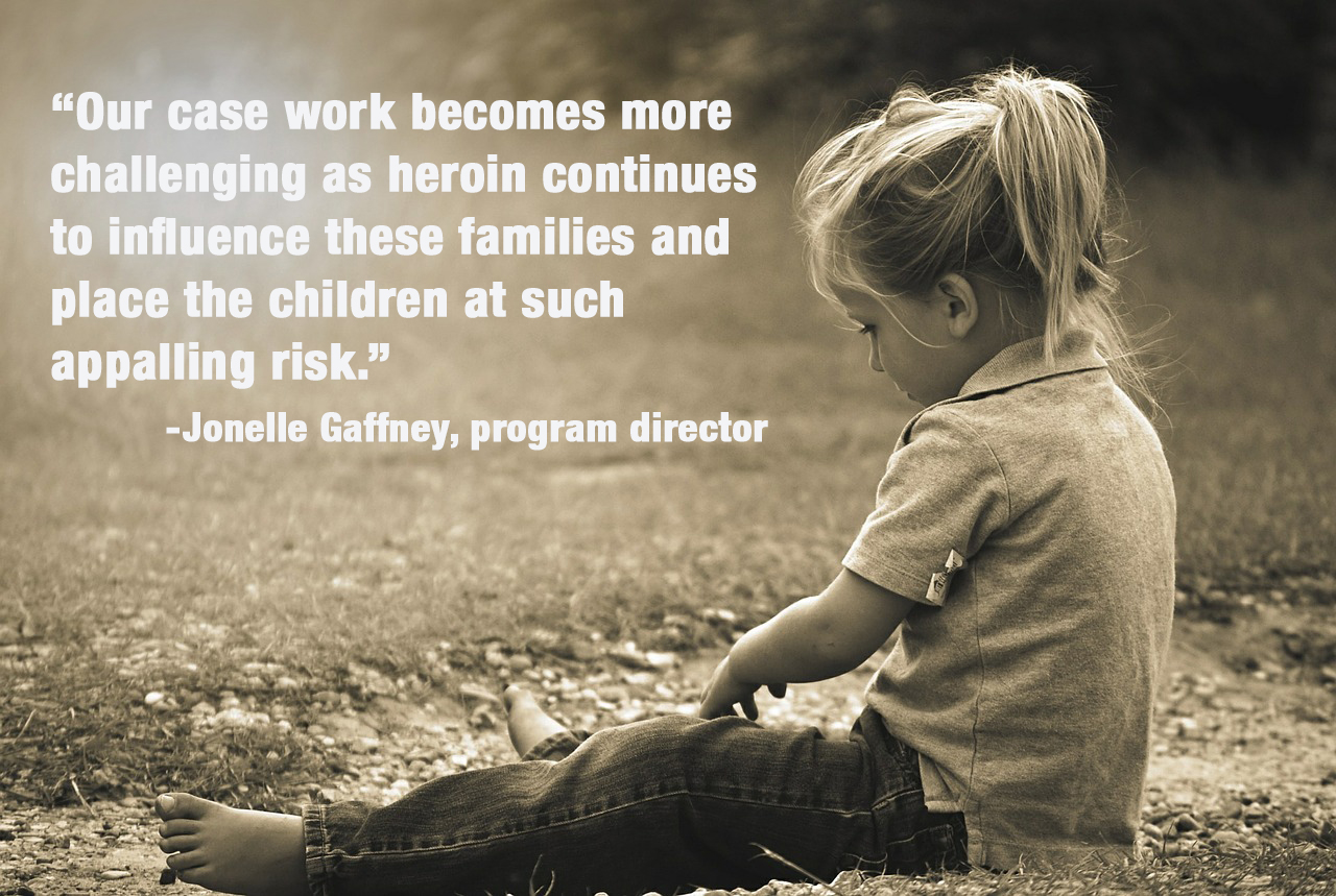 "Our CASA volunteer advocates witness that most cases involve substance misuse and it is undeniably having a direct impact on the children," says CASA Program Director Jonelle Gaffney. "These children continue to witness drug transactions and overdoses, and are constantly suffering from neglect at the hands of their parents. During a recent police raid, drug paraphernalia was found in a child’s toy box. One 6-year-old knew what a crack pipe was and how to use it. All in all, our case work becomes more challenging as heroin continues to influence these families and place the children at such appalling risk."