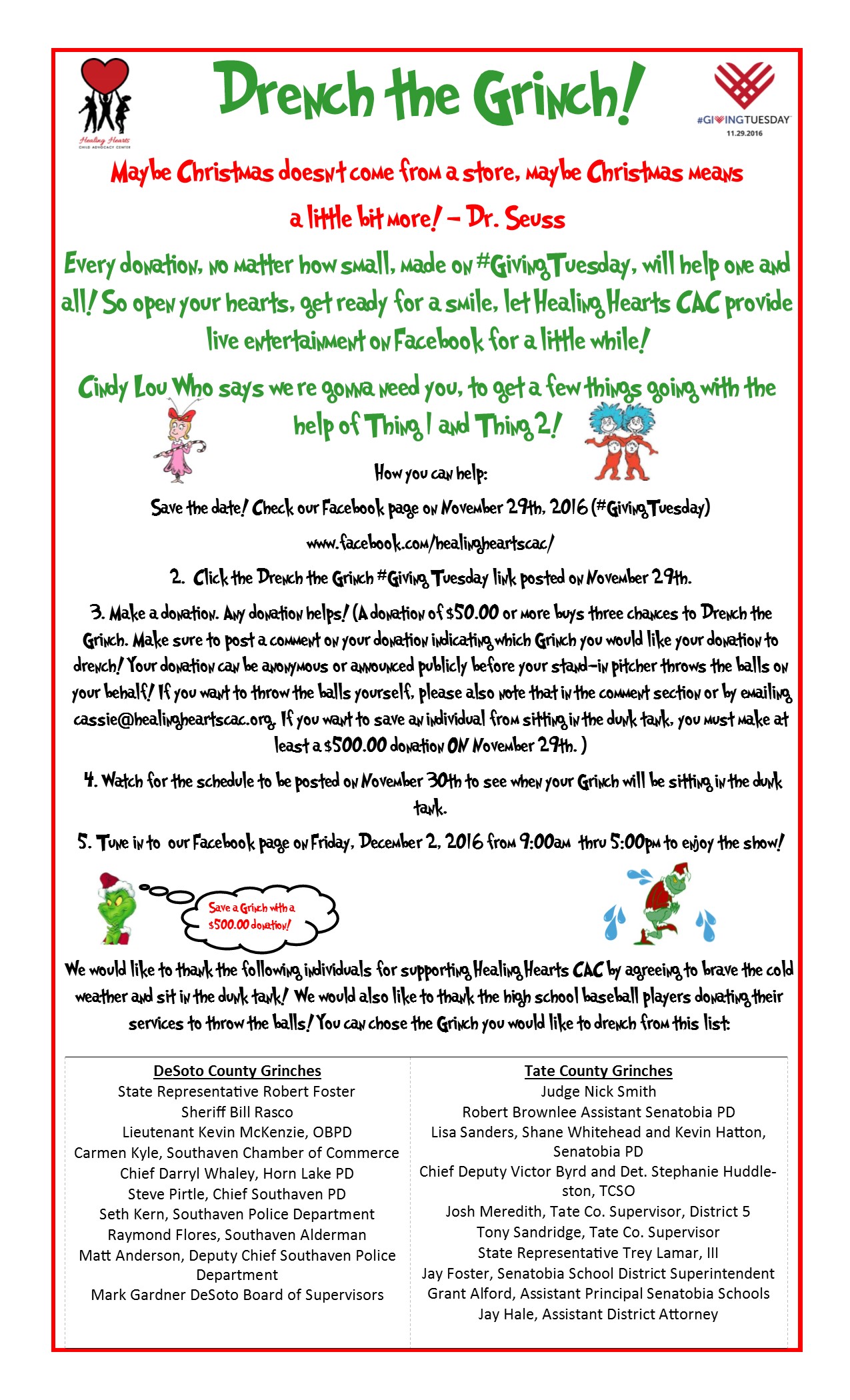 Healing Hearts Child Advocacy Center is a non-profit 501(c)(3) organization. We rely heavily on grant funding to provide services to the clients we serve. We receive grant funding from the Victims of Crime Act, HisWay, and United Way. Our grant terms require that we raise matching funds which we accomplish through fundraising, individual and corporate contributions and funding from local municipalities.