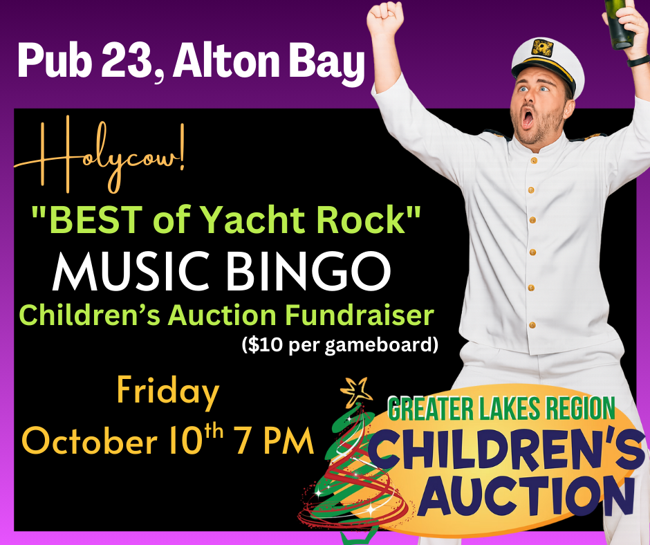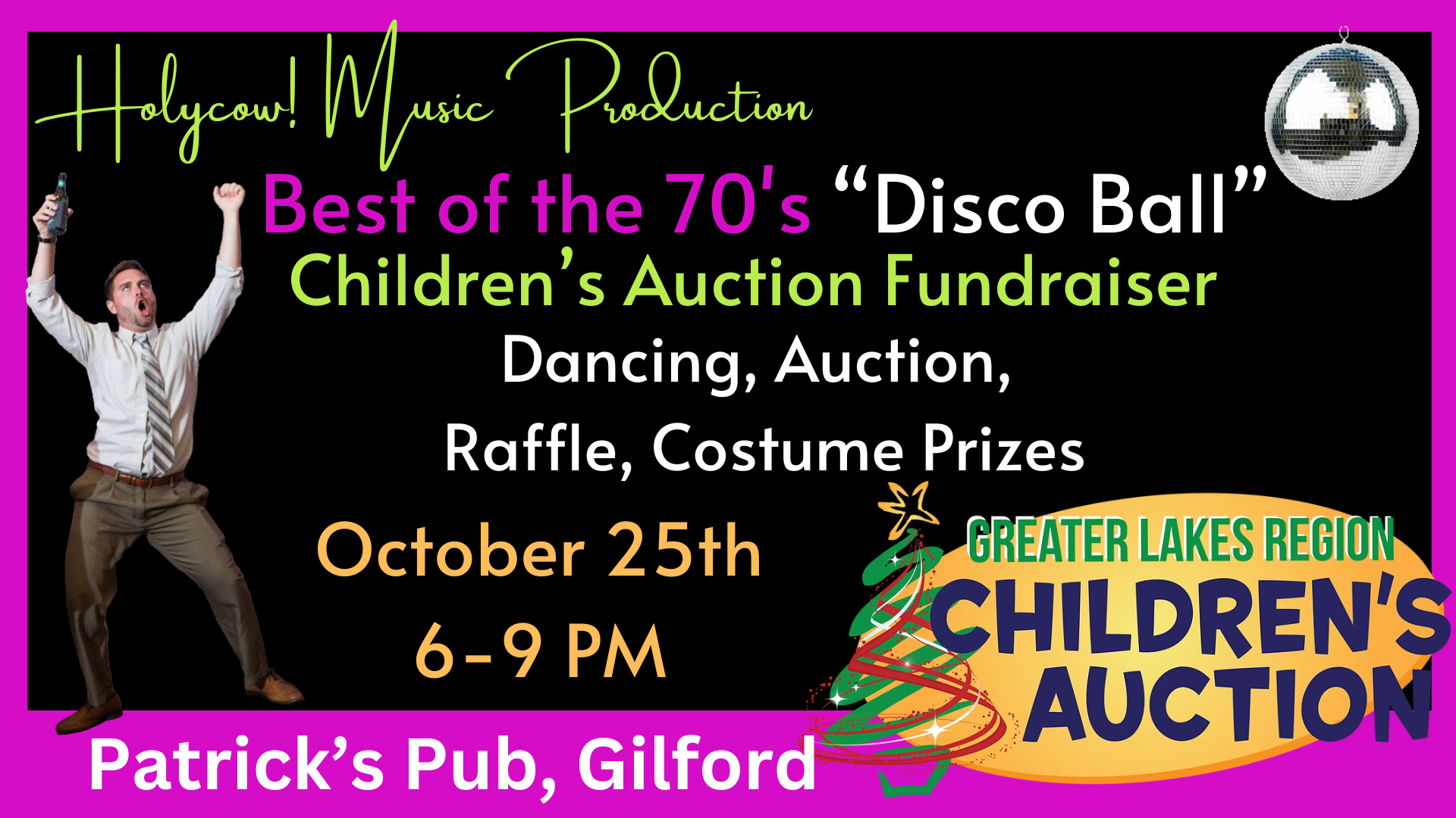 Holycow! Music Production is proud to support the Greater Lakes Region Children’s Auction! Our “Supa’Star Holycow! TEAM” is actively involved in local fundraising events including Pub Mania, Sweepstakes Socials, Music Bingo tavern games, our 70’s “Disco Ball,” and more. We’d love to see YOU enjoying our entertainment while supporting a great cause!